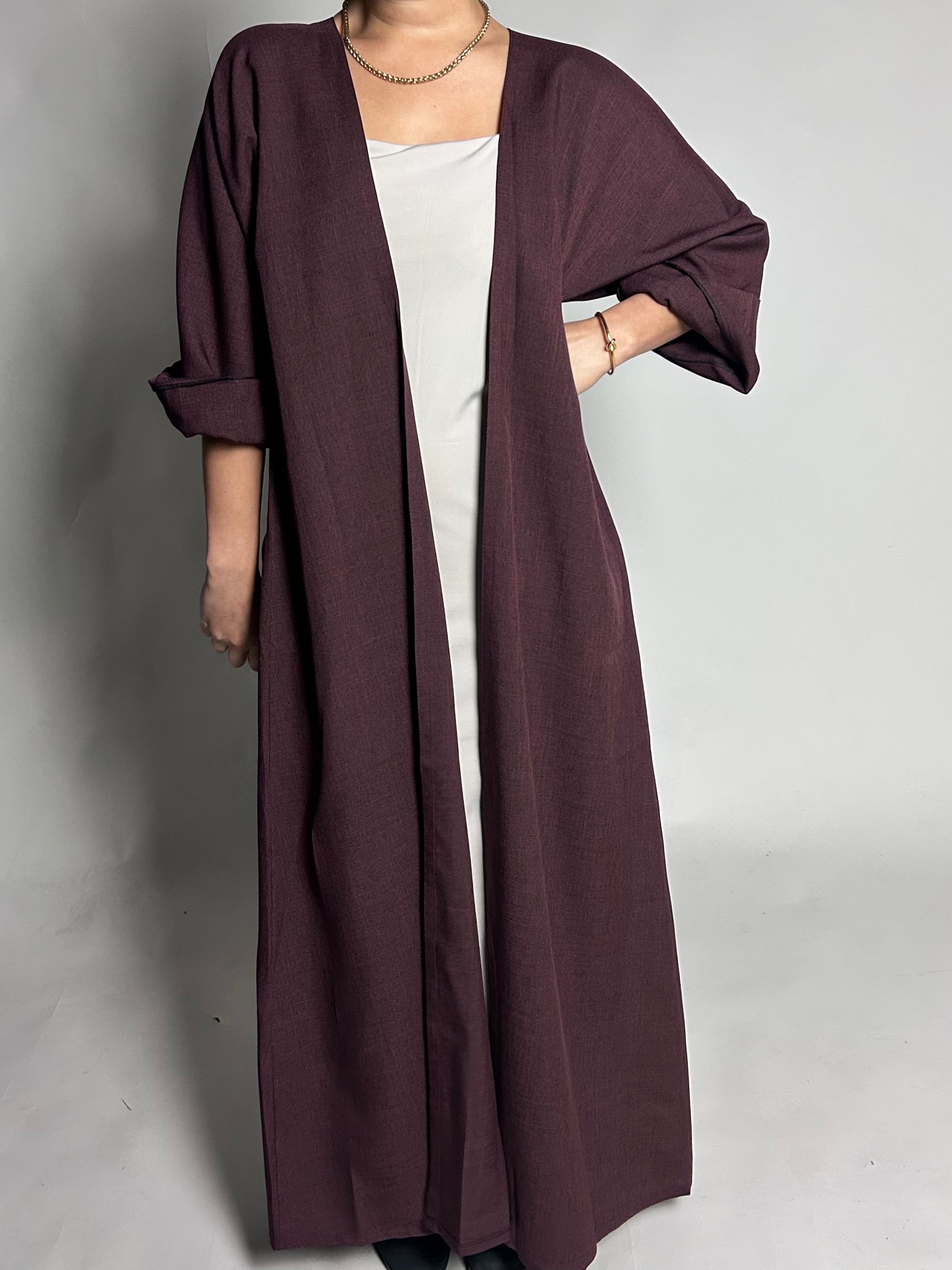 Casual and cool, this burgundy melange abaya goes with everything. Wide sleeves gives a trendy silhouette.
