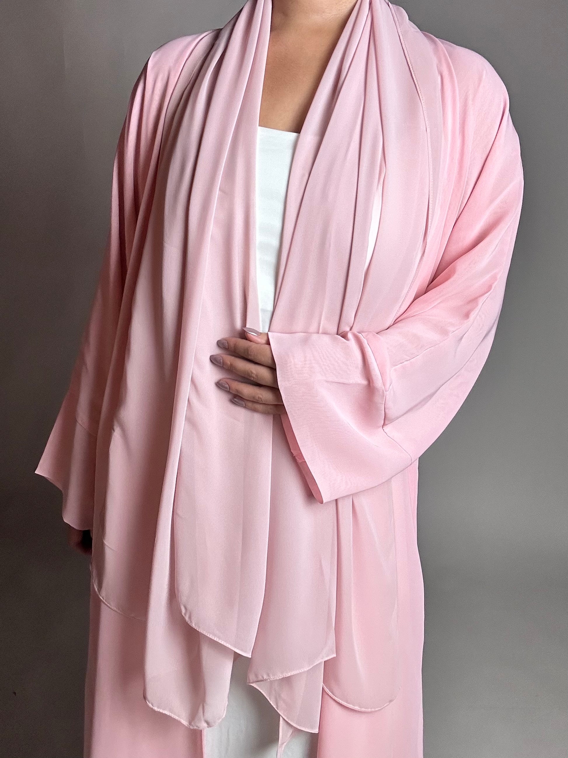 Flowy and lightweight, this double chiffon abaya is perfect for summer. Comes in 3 pastel colours, all including sheila/scarf.