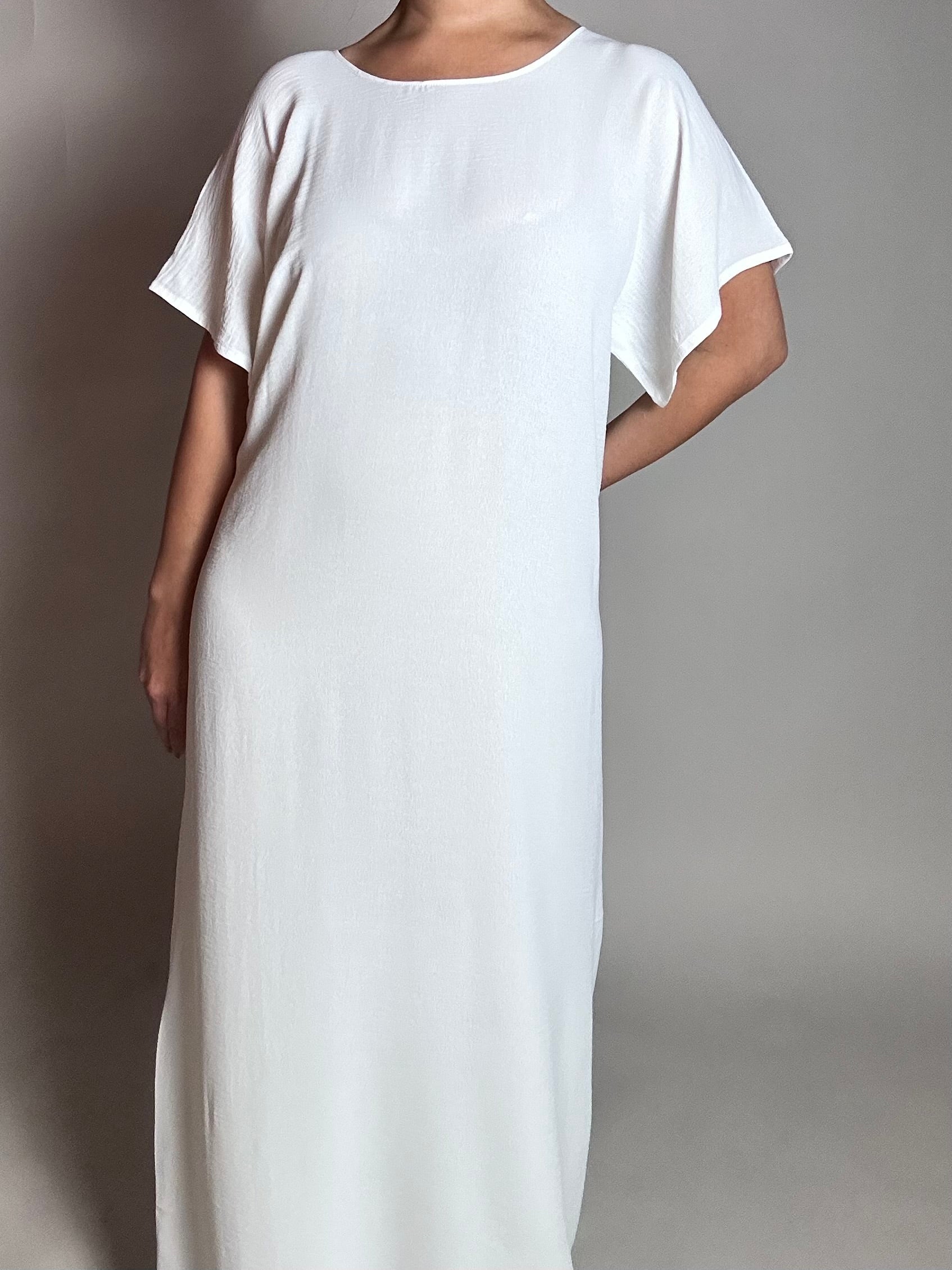 White slip dress with short sleeves, soft and flowy crepe material. Perfect when you need a base dress for open abayas.